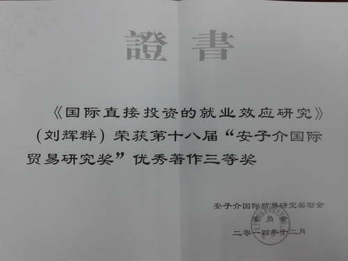 “安子介国际贸易研究奖”是由已故全国政协副主席、社会活动家、香港著名实业家安子介先生于 1991 年出资设立,并被教育部确定为部级奖。作为中国世界经济与国际贸易两个应用经济学二级学科的最高学术研究奖,现设“安子介国际贸易优秀著作奖”、“安子介国际贸易优秀论文奖”和“安子介国际贸易学术鼓励奖”。该奖项每两年评选一次,在国内外具有较大影响力。本届“安子介国际贸易研究奖”由近三十名海内外国际贸易领域知名专家担任评委,最终评出优秀著作奖 8 部,其中一等奖空缺,二等奖 3 部,三等奖 5 部;优秀论文奖 20 篇,其中一等奖 1 篇,二等奖 4 篇,三等奖 15 篇。刘辉群副教授的专著从众多优秀科研成果中脱颖而出,再次展现了 91av