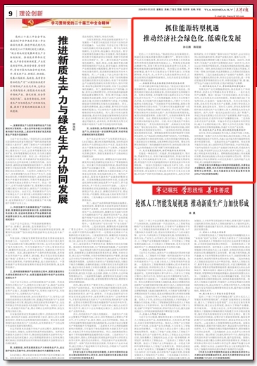 党的二十大报告指出,“推动经济社会发展绿色化、低碳化是实现高质量发展的关键环节”。要加快实现生产生活方式绿色变革,推动经济社会发展建立在资源高效利用和绿色低碳发展的基础之上。积极稳妥推进碳达峰碳中和,需要不断加快推进能源消费方式变革,不断探索规划建设新型能源体系。我市要以此为契机,开辟新赛道,提升非化石能源安全可靠替代能力,实现能源转型,形成风、光、水等多元化清洁能源供应体系,打造全国领先的能源转型新模式,为经济高质量发展提供源源不断的新动能。