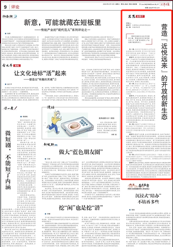 6月19日, 91av 91av 院长梁学平教授做客《天津日报》9版思想会客厅栏目,就“营造‘近悦远来’的开放创新生态”话题,与日报评论员开展对话。他指出,我们能从创新生态的营造中,看出一个地区对产业发展的长期规划和支持。产业发展所需的有针对性的扶持政策、丰富的人力资源、完善的基础设施、健全的金融服务体系、良好的科技创新环境皆在其中。